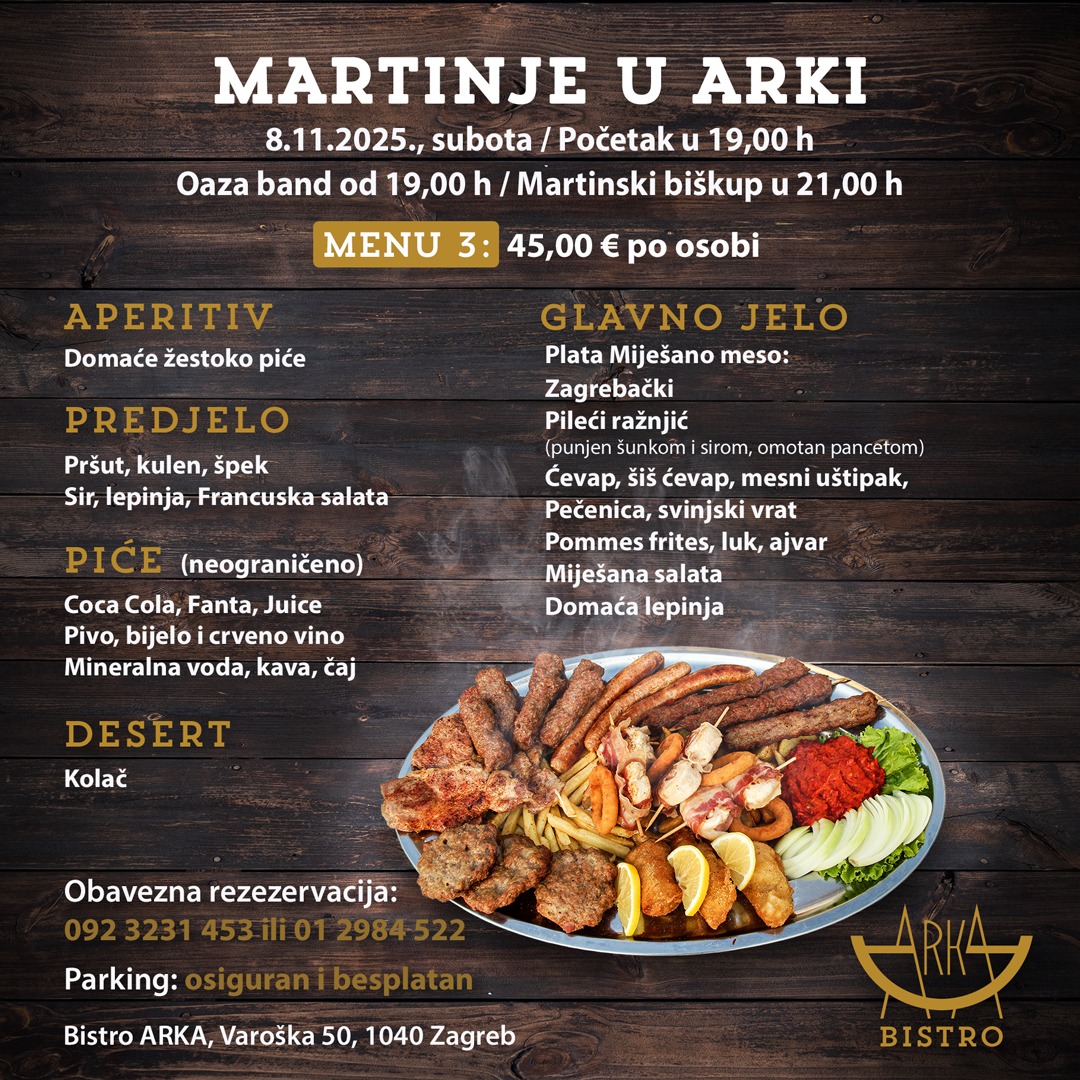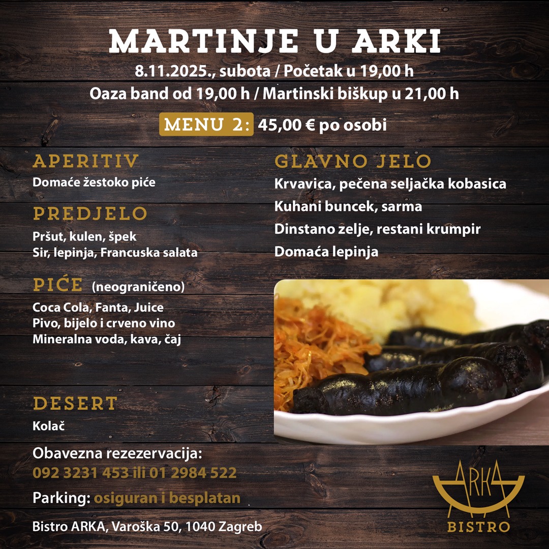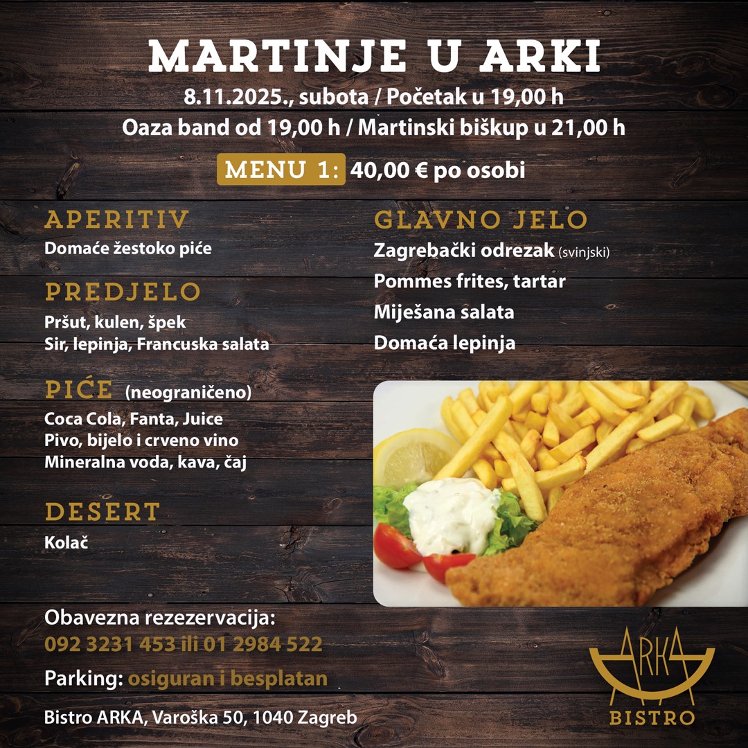 Martinje u ARKI 08.11.2025. ponedjeljak. Početak u 19:00 h. Oaza band od 19:00h. Martinski biškup u 21:00 h.